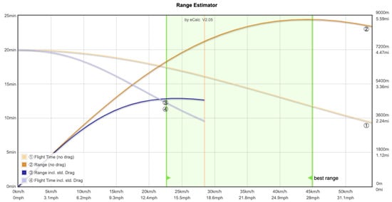 At the time of writing, the eCalc [] seems to be the best and most accurate tool, including, but not limited to finding the best motor–propeller–battery setup (see Figure 5 and Figure 6). Another great tool, especially for predicting electric RC plane performance, is MotoCalc []. We used it for detailed pusher propulsion performance prediction, e.g., to estimate top speed in level flight and find the stall speed for various wing setups (see Figure 7). Considering the general assumptions mentioned in Section 1, we decided to look for high-D/P-ratio propellers (diameter-to-pitch ratio), a high-voltage setup, and lithium-ion batteries rather than lithium-polymer ones. A propeller with a high D/P ratio provides great static thrust (a lift force in the case of a drone), but the thrust drops suddenly when the airspeed increases. That phenomenon, however, may impact drone manoeuvrability. Typically, fast and agile drones (e.g., racing quadcopters) use the D/P ratio in the range , where propellers with D/P close to 1 (e.g., ) allow high-speed flights, but consume much energy in hover. A high-voltage setup decreases the current needed (assuming a constant total output power)—lower current benefits in thinner electric wires, and smaller Electronic Speed Controllers (ESCs), thus a more lightweight setup. The Li-ion batteries usually offer greater capacity than Li-poly batteries of the same weight, but cannot work in high-current load conditions. The final setup of the quadcopter’s electric propulsion is presented in Figure 5 and Table 1, and the predicted performance of the drone (and its range) can be found in Figure 6. Predicted stall speed, top speed, and the total flight time can be found in Figure 7. A summary of the predicted performance is presented in Table 2.