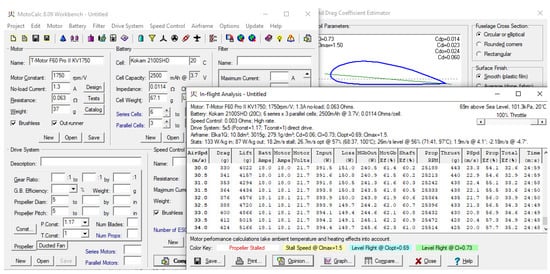 The MotoCalc 8.09 [] workbench; the tool helped us estimate the drone performance in level flight (plane mode).