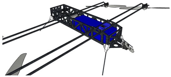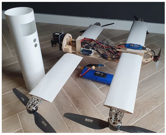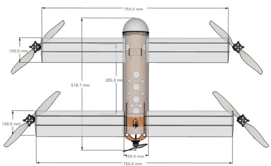 The overall shape of the drone (as seen in Figure 8 and Figure 9) is a compromise among the general assumptions (described in Section 1), size and weight of significant components (such as the battery pack), and smart usage of available materials.