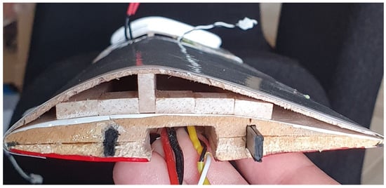 A wing that produces lift force also generates a downwash, i.e., the airflow direction behind the trailing edge of the wing is deflected down by the aerodynamic action of the wing. That phenomenon changes the effective Angle of Attack (AoA) of the rear wing in the tandem-wing configuration. Most tandem-wing planes have the front wing mounted lower than the rear wing to minimize the downwash effect of the front wing [,]. Additionally, it is recommended to set a higher AoA of the front wing than the aft wing—such a wing setup affects the stall behaviour of the tandem-wing plane. The front wing with a higher AoA will stall first while the aft wing still produces lift force—that situation will cause the plane to pitch down, increase the speed, and ultimately, end the front wing’s stall (bring back its lift force) []. Following the suggestions, the front wing of the Elka1Q drone was mounted at ca. 4° AoA and the aft wing at ca. 2° AoA.