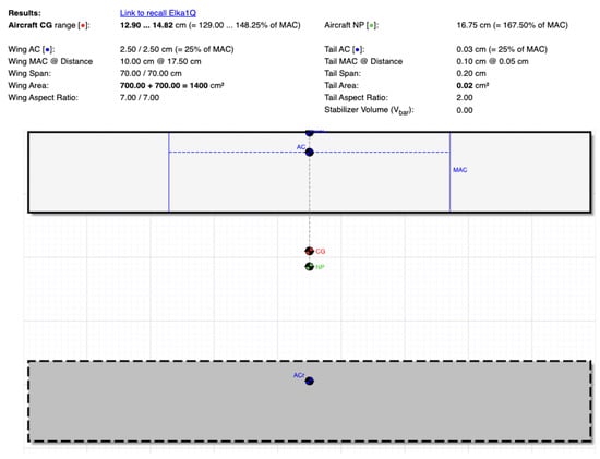 Finally, there is at least one more critical aspect of every aircraft having wings: Centre of Gravity (CG, CoG). It is crucial to keep the longitudinal stability of an aircraft. We used a CG calculator from the eCalc toolset []. The results of the calculation are presented in Figure 12.