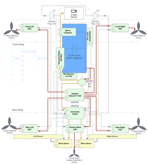 The complete diagram of all electronic components installed in the drone and wirings among them are presented in Figure 18. We chose the Holybro Kakute F7 AIO [] as the central Flight Controller (FC) board—mainly due to its compact size and efficient primary microcontroller (STM32F745). The FC board was attached to the fuselage through vibration dampers—which is crucial for correct onboard Inertial Measurement Unit (IMU) readings.
