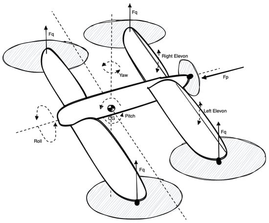 Axes of rotation and control forces produced by the drone’s motors and elevons (at the rear wing).