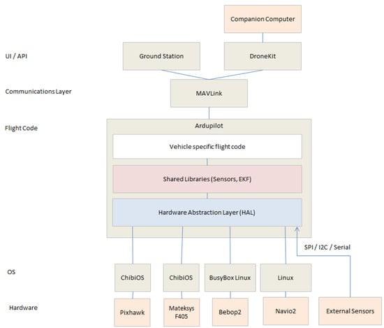 A high-level architecture overview of the ArduPilot software; image source: https://ardupilot.org/dev/docs/apmcopter-code-overview.html, accessed on 1 May 2022; published under the CC BY-SA 3.0 license: https://creativecommons.org/licenses/by-sa/3.0/legalcode, accessed on 1 May 2022.