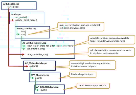 A high-level architecture overview of the ArduCopter software—a sequence of actions in a manually controlled flight mode; image source: https://ardupilot.org/dev/docs/apmcopter-code-overview.html, accessed on 1 May 2022 published under the CC BY-SA 3.0 license: https://creativecommons.org/licenses/by-sa/3.0/legalcode, accessed on 1 May 2022.