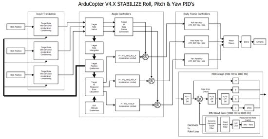 The structure of ArduCopter attitude controllers. Image source: https://ardupilot.org/dev/docs/apmcopter-programming-attitude-control-2.html, accessed on 1 May 2022; published under the CC BY-SA 3.0 license: https://creativecommons.org/licenses/by-sa/3.0/legalcode, accessed on 1 May 2022.