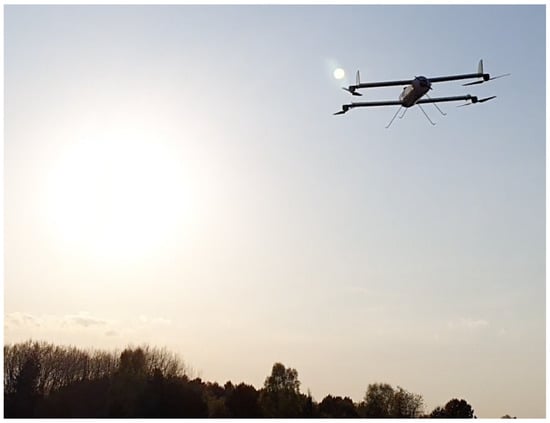 The wing configuration used in the drone is called a “tandem-wing” or sometimes a “lifting-tail plane”. Those names refer to the fact that the aft wing is not just a horizontal stabilizer, like in a classic “tailplane” configuration, but it contributes to the total lift force produced by the plane. It is a rare configuration due to possible stability and controllability issues [,]. Sometimes, quite the opposite statements can be found—tandem-wing planes are easier to pilot because of safer stall behaviour []. However, there were at least a few successful tandem-wing planes, e.g., Quickie designed by Elbert Leander “Burt” Rutan (and later QAC Quickie Q2) [,] and the Proteus [] built by Scaled Composites (Rutan’s company). Another famous tandem-wing plane is the “Flying Flea” (French name: “Pou du Ciel”), designed by Henri Mignet in 1933. A thorough study of many more historical and modern tandem-wing planes and UAVs, as well as their aerodynamic and stability studies, can be found in [].