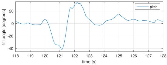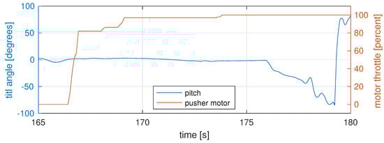 We implemented two new flight modes []: the FixedTestTrajectory and the Elka1Q mode. The former was helpful for model identification and controller tuning (described in detail in our other papers [,]), and the latter was entirely dedicated to the plane-like flight phase.
