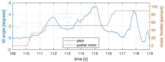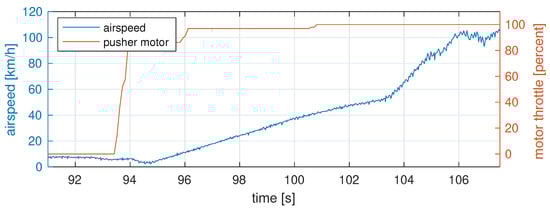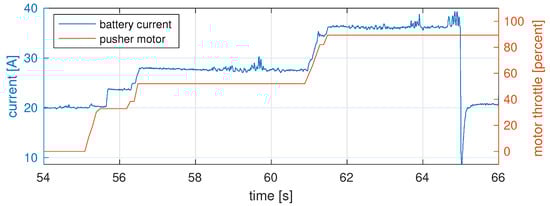 Figure 29 presents power usage in quadcopter mode (<55 s), during the transition phase (55–65 s; the drone accelerates with pusher motor; quadcopter motors still work) and plane mode (>65 s; only pusher motor works; other motors were shut down). It is worth mentioning that the electric power needed during the hover phase and the level flight in plane mode is nearly identical (total current drawn from the battery was ca. 20 A). The key difference is related to the horizontal speed of the drone in plane mode (above 100 km/h), while any non-zero forward flight speed in quadcopter mode requires more power than in hover. The eCalc predicts (see Figure 5 and Figure 6) that in quadcopter mode, the practical maximum speed will be less than 35 km/h at maximum main motor power (current readings over 60 A!). That proves the plane mode’s efficiency—the drone can fly 3× faster while consuming 3× less electric energy!