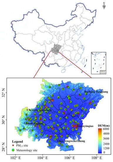 The study area we selected mainly includes Sichuan Province (except Ganzi, Aba, Liangshan, and Panzhihua) and the main urban area of Chongqing (Figure 1), which located in southwest China, with regional elevations ranging from 400–5000 m [39]. The study area is influenced by the Qinghai-Tibet Plateau to form high humidity and low wind speed atmospheric conditions, which are not conducive to pollution transmission and are prone to haze with the wide range and long duration leading to heavy pollution. Additionally, the population of the region is about 100 million, and a large amount of industrial, traffic, and anthropogenic emissions of pollutants leads to frequent heavy pollution weather [40].