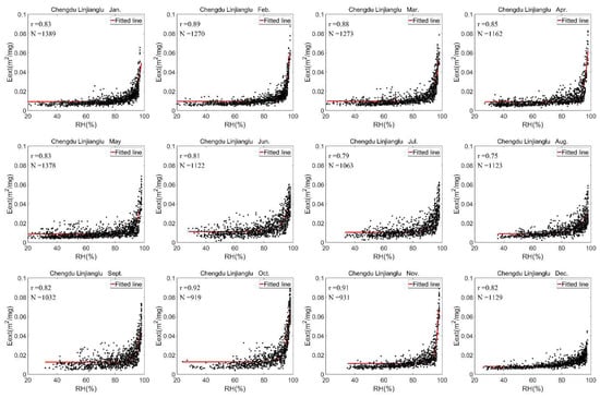The fitting results of the five stations have obvious differences: the fitted curve of the Chengdu Lingjianglu station is basically the same from January to December and shows a slow rise when the relative humidity is higher, indicating that the aerosol hygroscopic growth characteristics of this station are weak, and its aerosol sources and environmental conditions vary less with the season [54], which may be related to the location of the selected station in a built-up area. The differences in hygroscopic growth characteristics between the months are large at Leshan Jiajiang and Bazhong Tongjiang, which are located close to the river. The fitted curve of Leshan Jiajiang shows a slow rise from January to May but a sharp rise from June to October, indicating that the hygroscopic growth characteristics vary greatly with the seasons, and there is almost no relative humidity less than 40% in July and August. For Bazhong Tongjiang, the fitted curve shows a sharp and steep rise in all 12 months. The hygroscopic growth characteristics of Yibin Xingwen, located in a densely vegetated area, and Chongqing Guanyinqiao Station, located in a commercial area, are relatively similar, where the fitted curves both show a slow rise from January to December with no obvious deliquescence.