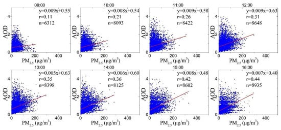 Scatterplot of AOD and PM2.5 at different times (09:00–16:00) in study area.