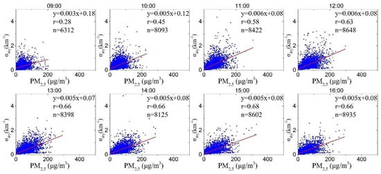 Scatterplot of “σdry” and PM2.5 at different times (09:00−16:00) in study area.