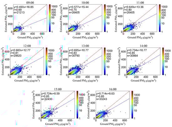 The comparison of Figure 4 and Figure 5 shows that the correlation between and PM2.5 is significantly improved after the vertical and humidity corrections compared to that between AOD and PM2.5, and the correlation coefficient increases from 0.11–0.44 to 0.28–0.68. The mass concentration of near-ground PM2.5 was estimated using Equation (8), and the hour-by-hour density scatter plots of satellite estimates against ground-based observations are shown in Figure 6, where the red dashed line is the 1:1 line, and the blue dashed line is the fitted line. According to Figure 6 the correlations are all high in general, but the correlation coefficient varies more from 09:00 to 16:00 (0.69–0.85), and the correlation is significantly higher in the afternoon than in the morning, the variation of which is consistent with the study of Xu [30]. This may be caused by the following two reasons: (1) in the morning hours, when the solar azimuth is larger and the atmospheric water vapor content is higher, the sunlight passes through a longer atmospheric path to reach the ground, which affects the accuracy of the AOD retrieval, and thus the PM2.5 estimation results may be relatively poor, especially at 09:00. (2) Particulate matter deliquesces with the increase in temperature, which may affect the results of humidity corrections [15] and thus affect the PM2.5 estimation results. (3) In the process of vertical revision, we use the visibility to calculate the near-surface extinction coefficient (). The fog or high humidity conditions in the morning over the Chengdu-Chongqing regions may affect the visibility measurement, thus affecting the final PM2.5 estimation [51]. (4) We fit this based on the monthly scale in constructing the hygroscopic correction factor grid, which may have a greater impact at 9:00 and 10:00 because of the high humidity conditions, so it is necessary to construct the hygroscopic correction factor grid for a more refined sub-hour.