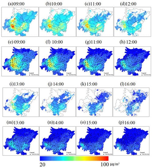 PM2.5 spatial distribution on 19 April 2017 09:00–16:00. (a–d,i–l) denote satellite estimation results; (e–h,m–p) denote model and satellite fusion results. The black arrows are wind direction.