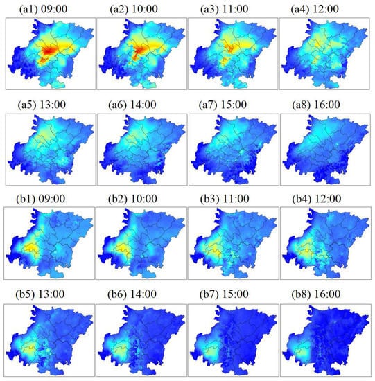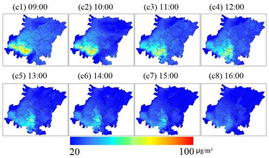 PM2.5 spatial distribution on 1 to 3 November 2018 at 09:00–16:00. (a1–a8) denote 1 November; (b1–b8) denote 2 November; (c1–c8) denote 3 November.