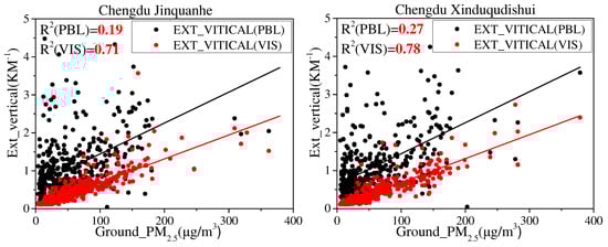 Scatter plots between LiDAR−calculated and visibility−calculated near−ground extinction coefficient and PM2.5. The black and red line are LiDAR-calculated and visibility-calculated, respectively.