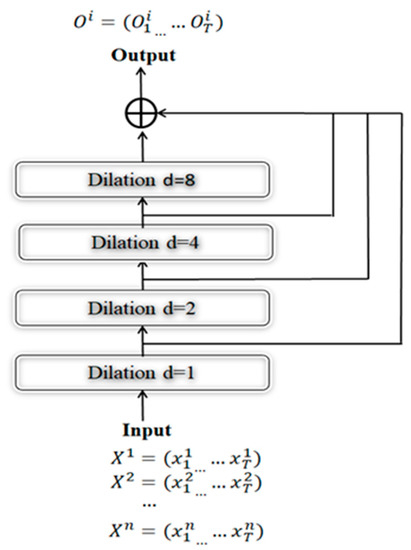 In essence, the TCN model was composed of one or more 1D convolutional layers with dilated residual blocks for input processing. Through use of the residual block in the convolutional layers in TCN, deep and large TCNs can achieve further stabilisation. TCNs are useful for all types of long sequence problems because they can perform feature extraction and correlation analyses. An example of the residual block (d = 8) used between each layer in the TCN to accelerate convergence and enable the training of deeper models is shown in Figure 2.
