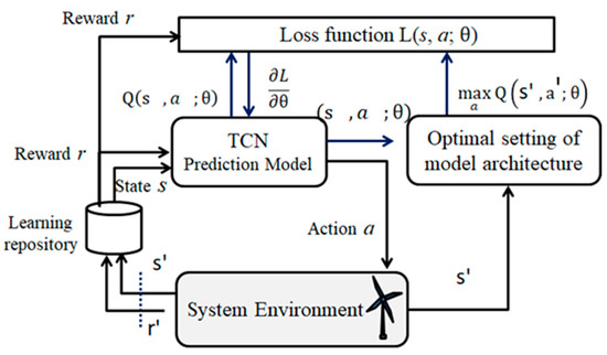 In the training phase, the present study used a TCN model pre-trained on the experimental dataset containing collected wind turbine data from the Chang-Bin wind power plant in Taiwan from 2020 to 2021 (2-year period) and incorporated a Q-learning algorithm to determine the optimal parameters for the developed models in the training process (Figure 3). As shown in Figure 4, the selection process for architecture parameters is modelled as an MDP.
