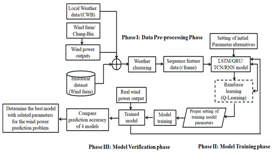 To improve forecasting accuracy for wind turbines, this study proposes a DLN-based model [7,8,9,10,11,12,13] with a Q-learning algorithm for wind power forecasting to determine the hyperparameters for four competing models by minimising the prediction error. There are several options with regard to DLN model choice; here, four sequence-to-sequence models for deep learning were compared to examine the model performance and recommendations for wind power forecasting. In the experiment, four completing models were pre-trained using real historical climate data and power generation outputs of wind turbines from a wind power farm in the Chang-Bin industrial zone of Taiwan. The experimental results show that the TCN exhibited higher prediction accuracy compared to recognized recurrent networks, such as GRUs, LSTMs, and RNNs. In developing the proposed model, our work focused on three important aspects: