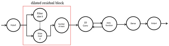 A TCN block was regularly selected using the combinational 1D fully convolutional architecture followed by a nonlinear activation function (rectified linear unit, ReLU) to determine the weights of an input sequence that improve classification accuracy in model prediction, then adding a dropout function to reduce overfitting. In other words, a dropout function in a dense layer decreases the number of parameters to be learned and helps reduce overfitting. From a design perspective, the TCN is capable of handling a series of uncertain length and outputs it with the same length. Experimental results [17,18,19,20] have shown that TCNs exhibit better performance with sequences of uncertain length, where the TCN architecture performs well in very long sequences of inputs. Sequence data prediction is the most frequently encountered issue in the TCN model, which is illustrated as follows [11].