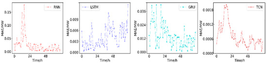 The prediction errors for the RNN, LSTM, GRU and TCN models (72 h ahead).