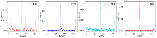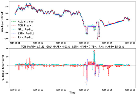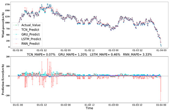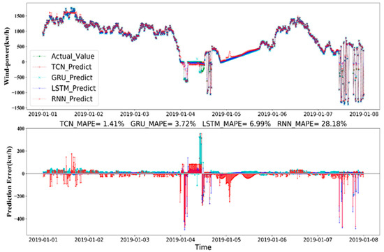 In the experiment, 1-year historical data were used to train four DNNs for wind power data, and the prediction results for 72, 120, and 168 h ahead are shown in Figure 11, Figure 12 and Figure 13, respectively. Figure 13 shows the accuracy associated with using four different prediction models where the prediction error of the TCN mode for 168 h (7 d) ahead had the highest prediction accuracy, MAPE = 1.41%, followed by GRU mode MAPE = 3.72%, LSTM mode MAPE = 6.99%, and RNN mode MAPE = 28.18%.