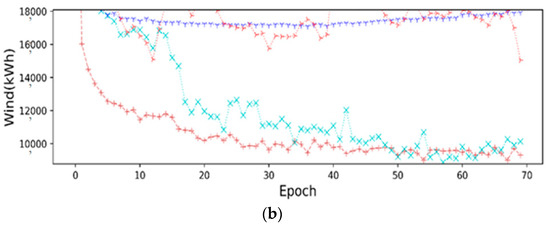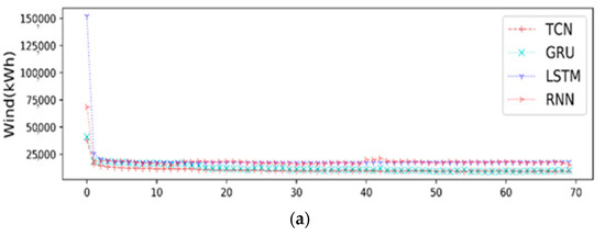 As shown in Figure 14a, the precision of four prediction models was increased by the decreased convergence error of the cost function in each iteration of the model training. More concisely, the descending speed of error convergence for the cost function was rapid with the increasing number of iterations (epochs). After 60 iterations, the loss function tended to be stable when TCN and GRU prediction models were applied (Figure 14b). However, the errors for the RNN and LSTM models did not converge slowly. Notably, the convergence error of the TCN model decreased more than that of the GRU model close to the fifteenth epoch, and the convergence error decreased steadily as the number of iterations increased. The experimental results revealed that the prediction error of the TCN model decreased the most steadily among the four models, followed by GRU and LSTM.