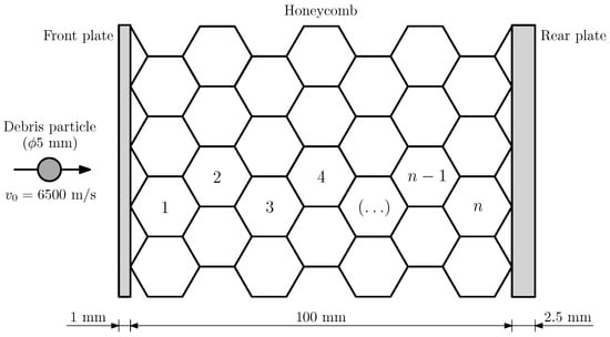 The proposed modified Whipple shield has a honeycomb layer—the shield core—between the bumper plate and the rear wall. The honeycomb is orientated with the axis of the cells perpendicular to the impact direction, as shown in