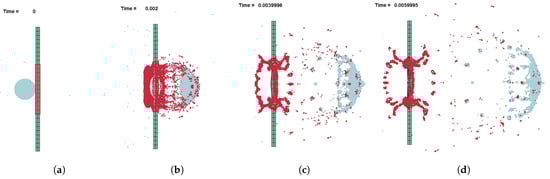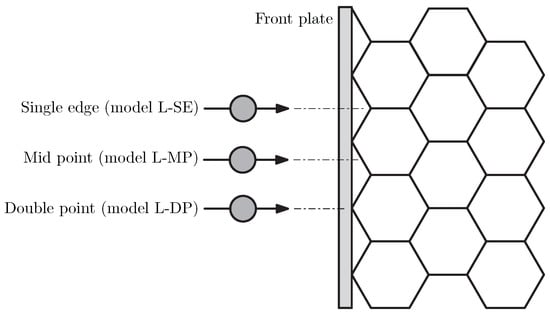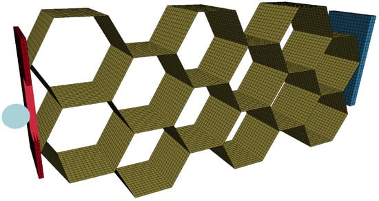 Solid constant stress solid elements are used to model the bumper plate and black wall, and four-node constant thickness shell elements are used in the honeycomb structure. The same mesh size is used in both the bumper and back plates and a thorough mesh convergence analysis is carried out to determine the optimal mesh size. The spherical projectile and the impact area on the front plate are modelled using Smoothed Particle Hydrodynamics (SPH). The convergence analysis was also extended into the SPH domain to determine the optimal particle density, especially as this method is highly computationally heavy and often leads to high CPU times. Specific contacts were implemented to model the interaction between the different model components: (i) tied contacts between the finite element and the SPH particles in the bumper plate, and (ii) automatic contacts between all SPH particles—both from the impactor and the impacted area—and all other finite-element components in the model (the back plate, the front plate and the honeycomb). In LS-DYNA, these contacts were implemented with the keywords *CONTACT_AUTOMATIC_NODES_TO_SURFACE and *CONTACT_TIED_NODES_TO_SURFACE, respectively.