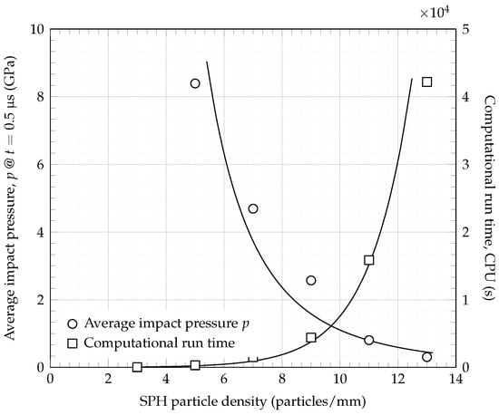 p and computational runtime against the SPH particle density, allow for a converging solution to be more easily identified. A clear convergence can be observed from an SPH particle density of 5 particles/mm to 13 particles/mm. The computational runtime is shown to exponentially increase with an increase in the SPH particle density. This clearly suggests that using fewer SPH particles within the model is a more efficient approach. The intersection of best-fit curves in