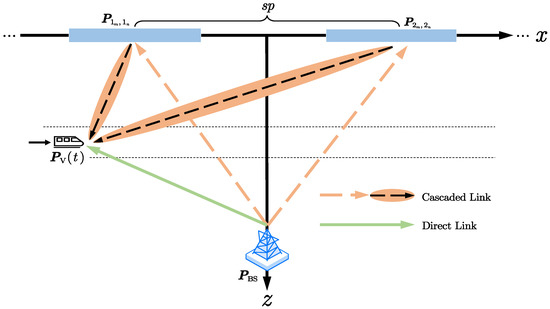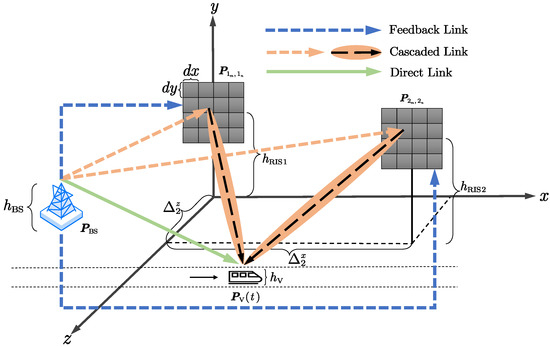 and is obtained in the same way as . The x and z coordinates of the center for the i-th RIS are and , respectively. It is noteworthy that we assume the reflecting sides of all RISs always orient to the vehicle [21].