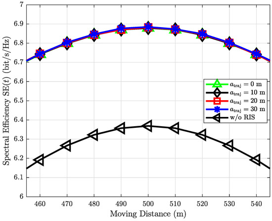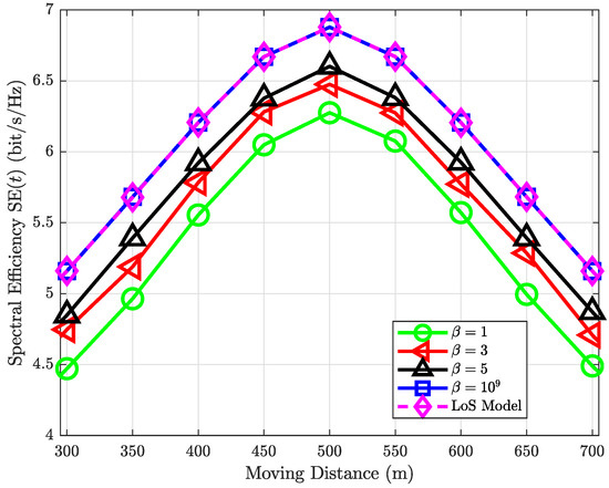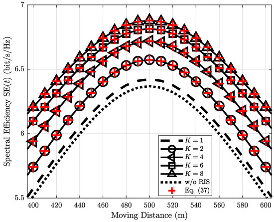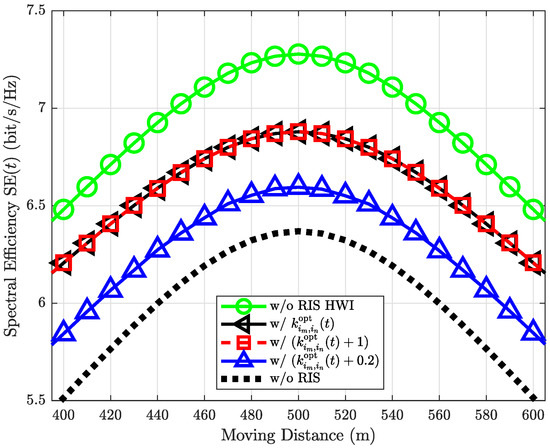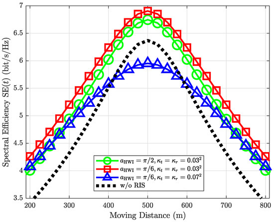Figure 8 reveals that the impact of RIS HWI diminishes in high SNR regions. In particular, when the moving distance is from 400 m to 600 m, i.e., the system is in a high SNR region, then the HWI in transceivers mainly decreases the SE instead of the RIS HWI. For example, the case , performs the worst with the high SNR, but after 700 m, its performance is the same as , . In other words, after 700 m, the main factor that decreases the SE is the RIS HWI. Besides, in high SNR regions, the SEs of the two cases with are higher than the case with . However, if the SNR becomes lower (e.g., the moving distance larger than 600 m), the impact of the RIS HWI becomes severe.