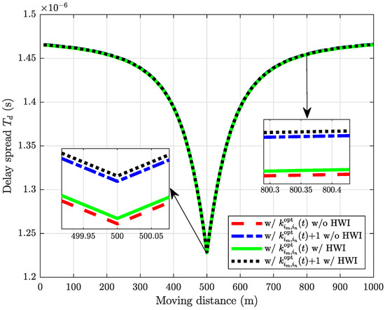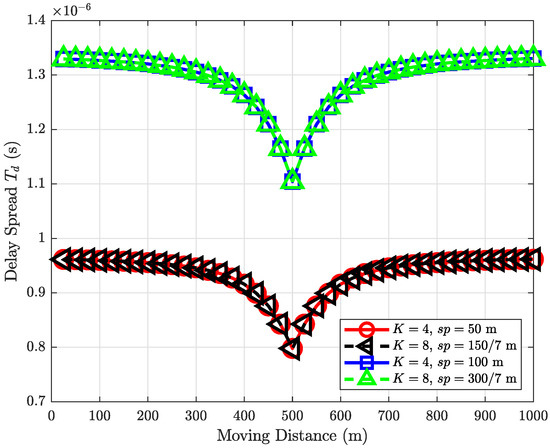 Figure 6 shows the delay spread for different numbers of RISs for one vehicle pass. In particular, more RISs cause a larger delay spread, although the SE can be improved when K is not very large. For example, when the moving distance is 500 m, the case has s delay spread, but it increases to s when . It is noteworthy that the maximum cyclic prefix of 5G is s [43]. Therefore, if K is large enough, it is possible that the delay spread exceeds the maximum cyclic prefix.