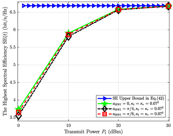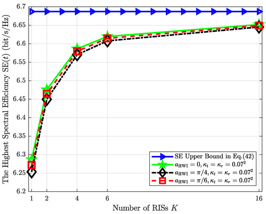 Figure 9 and Figure 10 validate Special Case 2. The figures show the relationship between the highest SE for one vehicle pass and different K () when the optimal phase shift set (33) is used. It can be seen that when K () becomes large, the main factor that decreases the SE is transceiver HWI, i.e., and . For example, the SE grows significantly from 3.5 bit/s/Hz to 6.5 bit/s/Hz when the transmit power is from 0 dBm to 20 dBm. When dBm, however, there is almost no SE increment. The same pattern can also be observed when K increases from 2 to 16. Besides, the RIS HWI has minimal impact on SE when dBm or .