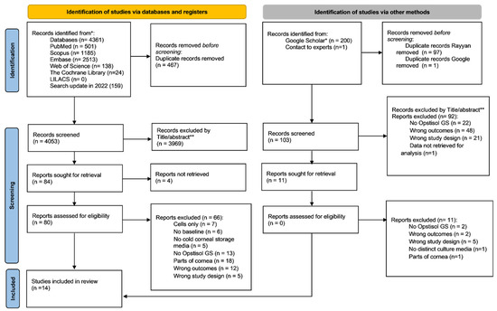 The initial search identified 4361 records and 159 were retrieved in the updated search in May 2022 as shown in Figure 1. After the removal of duplicates, a total of 4053 records were screened. Considering the eligibility criteria, 3969 records were excluded and 84 studies were selected for full-text reading. Four reports were not retrieved in full text [16,17,18,19] after unsuccessful contacts with authors or library sites. Considering 80 eligible studies, 66 were excluded for the following reasons: cells only (n = 7), no baseline (n = 6), no cold corneal storage media (n = 5), no Optisol-GS (n = 13), parts of cornea (n = 18), wrong outcomes (n = 12), wrong study design (n = 5), and data not retrieved for analysis (n = 1). In this manner, fourteen records originating from the main databases were selected. Regarding the records identified via grey literature, the first two hundred matches from the 3250 results in Google Scholar were assessed for the study. One duplicate record was manually removed from these sources, another ninety-seven were identified as duplicates by the Rayyan® Web software, and one was removed by duplicate records from Google. Furthermore, 92 records were excluded by title/abstract reading: no use of Optisol-GS (n = 22), wrong outcomes (n = 48), wrong study design (n = 21), and data not retrieved for analysis (n = 1). No remaining records were assessed for eligibility from the other resources since no articles were found on OpenGrey. Therefore, 14 studies were included in this review.