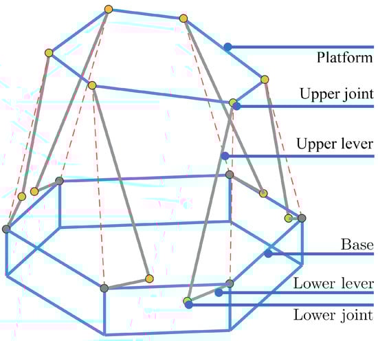 There are many different types of geometrical interpretations of the Stewart platform, but the main objective of this paper is geometry optimization of the Stewart platform with rotary actuators, as shown in Figure 2. It has six pairs of upper and lower levers (together called legs), and the movement of the upper platform relative to the base is achieved by rotating the lower lever around an axis going through one end of a lever. This is the revolute joint between the base and a lower lever controlled by an electric motor. The upper and lower levers are connected with universal or spherical joints, which connect the upper lever and platform. This is why this type is also called 6-RUS, in accordance with the types of joints.