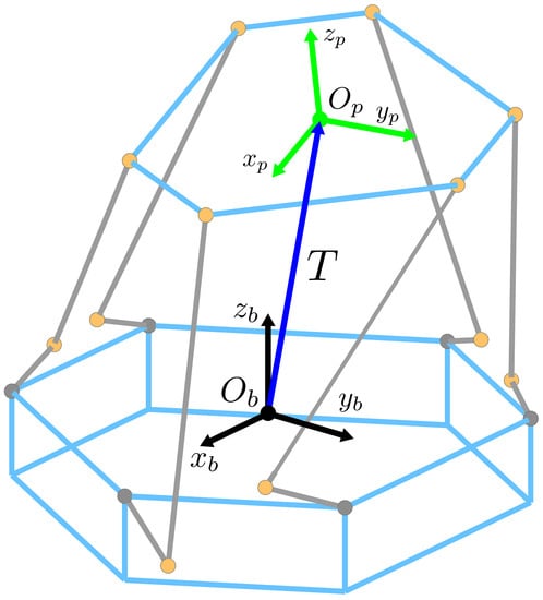 As shown in Figure 3, the first step is to define two reference frames. A global reference frame () is fixed to the center of the base and a moving platform reference frame () is fixed to the center of the platform.