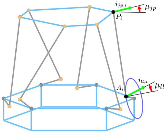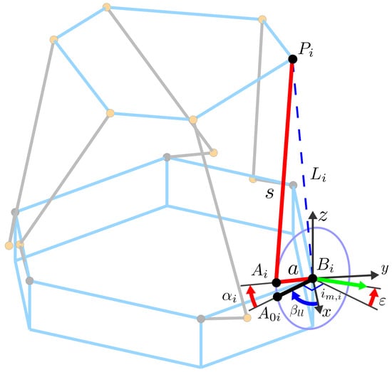 Unit vectors of joints are again shown in Figure 9; their orientation in planes of the platform and the base are already discussed, but two more and two last geometric parameters are introduced for total orientation. Vectors are tilted in reference to the corresponding planes by angles and . The same principle is already used for the actuators, and the following equation is obtained: