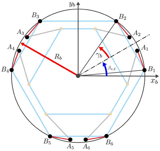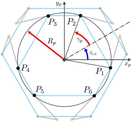 Similar to points , the position of all six points in reference to the platform’s reference frame is defined by the following two variable geometric parameters, radius and angle , as shown in Figure 6. There are again three axes of symmetry between points, the same as in the case of the base.