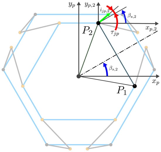 Angle and radius are the next two variable geometric parameters that are used to define the position of the point relative to the previously defined axis of symmetry. In order to define both points and , located on different sides relative to the axis of symmetry, a vector is introduced. This vector also has a constant value for all considered geometries. Its purpose is also to define different rotation directions of even and odd indexed actuators.