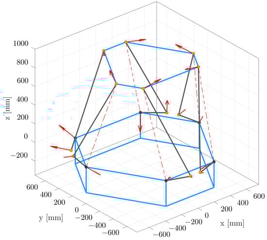 As shown in Figure 7, the actuator’s axis of rotation does not have to be normal to the line passing through points and but this line is a referent line for the definition of the orientation of lower levers in the horizontal plane (when lower levers are in the home position). This referent line is defined with the angle measured from the x axis of the global reference frame. The valueof this angle is defined with a vector for each lower lever.