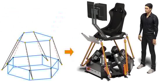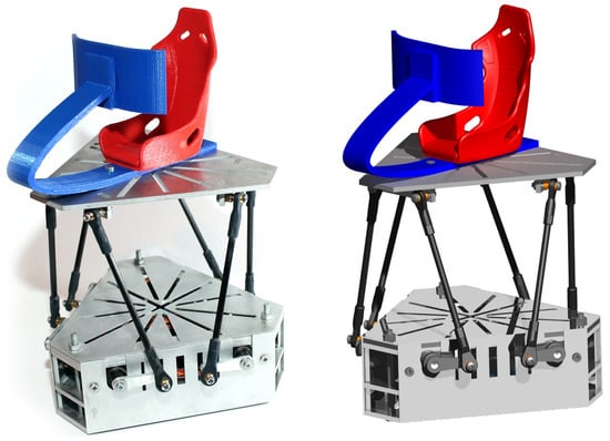 Among many existing designs, parallel mechanisms (mechanisms with closed chains) based on the Stewart platform, defined in [], are most frequently used for flight simulators. From this first work until today, this mechanism is a popular research topic in robotics with many research papers published about inverse and forward kinematics problems [,], dynamics [,,,,], singularities and workspace estimation [,,,,]. In a paper [] written in 1998, the authors presented a state-of-the-art review of the literature on the Stewart platform and mentioned papers are still the basis of research. A similar overview paper was written in 2016 [].
