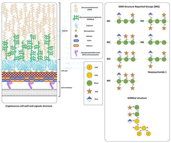 Cell wall and the polysaccharide capsule structure of Cryptococcus spp. with description of the molecular structure of the capsule polysaccharides glucuronoxylomannan (GXM) and glucuronoxylomannogalactan (GXMGal).