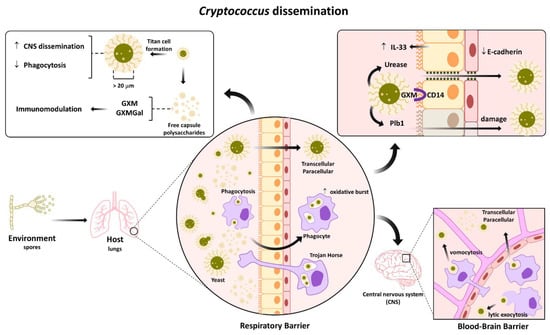 After its establishment in the lung tissue, the capsular and cell body growth of the fungus occurs, a mechanism that is closely associated with the impediment of phagocytosis and formation of titanized yeasts. Titan cells have been found in both C. neoformans and C. gattii [185,186]. These yeasts have a size greater than 20 µm in cell body diameter and have a greater-than-normal capsular thickening, which gives the yeast greater external coverage with its structural virulence factors [187,188]. A characteristic that the fungus has during infection is the tropism for the central nervous system [189], and associated with this, the titanization of the yeast is a morphological modification that is linked to favoring the spread to this region of the organism; however, C. gattii is less likely to disseminate to the CNS as compared to C. neoformans, and C. gattii is more likely to present as pneumonia [171,190]. After the establishment of the yeast in the lungs, the fungus can spread to other organs in the organism, resulting in the progression to systemic cryptococcosis [191] (Figure 2). This extrapulmonary spread favors the passage of the fungus to the central nervous system and can be mediated by the action of phagocytes present in the pulmonary alveoli, residing in the site of infection in the lungs [189]. There are several mechanisms proposed for this dissemination, the “Trojan Horse” being one of the most observed [192]. In this dissemination, the yeast is internalized by resident phagocytes and migrates through transcytosis through the epithelial barrier; thus, the intact yeast inside the cell can migrate to the various tissues that the phagocyte finds in the body, including the central nervous system, going through the phagocyte by lytic or non-lytic extrusion, also called vomocytosis. Both C. neoformans and C. gattii have already presented this type of transport [193]. Yeast can be either phagocytosed or actively enter the cell body, by mechanisms not yet well elucidated [194] and, in addition, the cell can migrate through the pulmonary endothelium and blood–brain barrier by paracellular passage (between cells) and transcellular passage (through the cell) [195,196] (Figure 2). Interestingly, even rare, transplacental migration can occur, with cases already well documented on this topic [197]. Although the transfer of yeast by the organism mediated by phagocytes is well described, there are other mechanisms by which Cryptococcus spp. can cross physiological barriers, such as transcytosis by epithelial cells, already described as mediated by the binding of GXM with the CD14 receptor and palmitic acid from the yeast by binding to the pulmonary surfactant protein D, both mechanisms starting with the facilitation of cell adhesion [198,199]. A similar mechanism has been associated with the binding of hyaluronic acid on CD44, also facilitating cell adhesion and the metalloproteinase Mpr1 engaging Annexin A2 in the transfer of yeast transcellularly across the blood–brain barrier [200,201]. In addition to these mechanisms, Cryptococcus yeast produces urease and induces the release of IL-33, which leads to the dissociation of tight junctions in the epithelium, facilitating paracellular passage [202,203]. Urease, as well as other proteolytic enzymes and Plb1, are capable of destroying the epithelial cells in the blood–brain barrier, favoring the passage of yeast [204,205] (Figure 2). Despite the mechanisms of dissemination of yeasts, dependent on their intrinsic factors, the dissemination of Cryptococcus through immune cells is particularly important, mainly due to the subversion of cellular activity that the capsular constituents of yeast promote [189]. In this way, phagocytes have already been demonstrated important in the dissemination of the fungus to the central nervous system [206]. In general, the exopolysaccharides exuded by the internalized yeast accumulate inside the cell and, in a way that has not yet been elucidated, suppress the intracellular defense mechanisms [207].