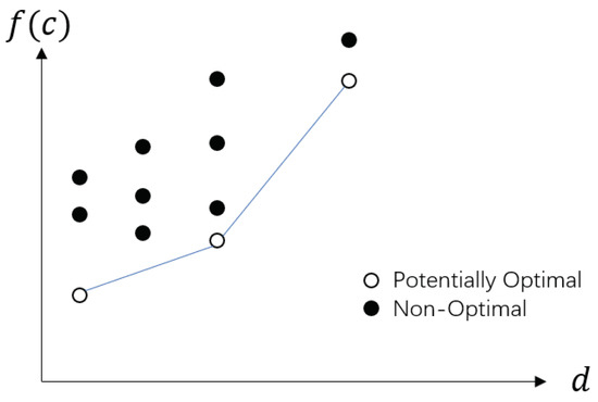 where is a positive constant, is the function value at the center point of hyperrectangle j, and refers to the center-vertex distance of hyperrectangle i, and denotes the current optimal function value. Figure 1 shows the properties of potentially optimal hyperrectangles more intuitively.