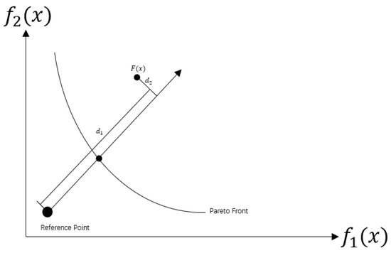 As mentioned earlier, the selecting strategy for potentially optimal hyperrectangles is essential to the DIRECT algorithm, which means a possible modification or alternative that makes it suitable for multiple objectives is a straightforward manner for the DIRECT algorithm’s extension. Decomposition is a basic idea which has been applied in many popular multi-objective algorithms, such as MOEA/D. Based on decomposition, the original problem is transformed into multiple scalar sub-problems in the direction of weight vectors, and then achieve optimization simultaneously. The penalty-based boundary intersection (PBI) approach is a commonly used decomposition method [16]. Through PBI, a MOP is converted into the following scalar optimization subproblem using the weight vector and the reference point (see Figure 2).