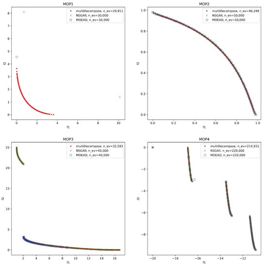 PFs of multiDecompose, NSGA-II and MOEA/D on all MOP instances where denotes the number of the function evaluations.