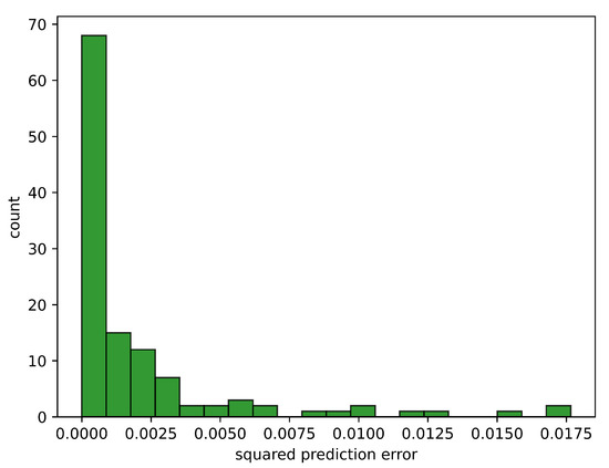 More specifically, we first train a random forest model on the basis of the dataset mentioned earlier to predict monthly stock returns. Then, we summarize the squared prediction errors for all 10 stocks in 2019 and display the distribution in Figure 6. It can be seen from the histogram that most of the squared prediction errors are maintained below 0.005, which verifies that the forecast values obtained from the random forest model are qualified to generate a view vector and the confidence matrix for the subsequent BL model.