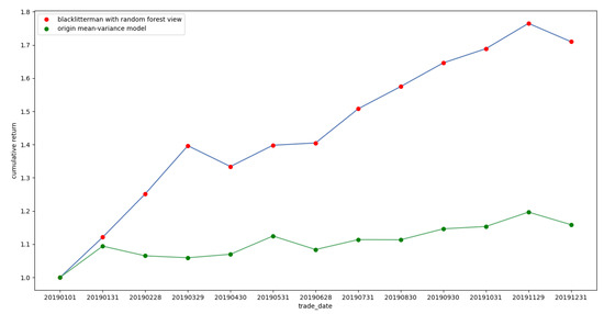 Figure 7 reveals the cumulative returns of the proposed model and classic MV model in 2019. Obviously, the proposed model significantly outperforms the classic MV model during the whole period of backtesting, and its annual return reaches compared to for the MV model, which is consistent with our analysis before. From the perspective of the Sharpe ratio, the proposed model has a better Sharpe ratio of while the ratio is for the MV model. We can conclude from the above results that the proposed model is superior to the MV model in terms of portfolio performance.